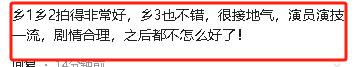 “乡1乡2拍得十分好,乡3也可以,很接地气,演员演技一流,剧情合理,之后齐不怎样好了!”