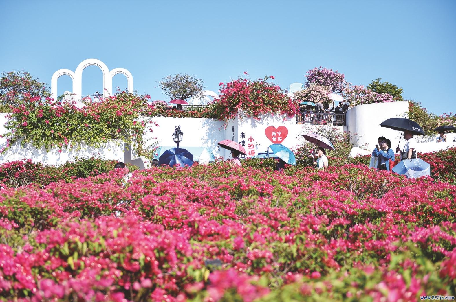 周末去景点游玩是许多家庭的首选。图为东谈主们在青秀山神色区叶子花坛赏花。 本报记者潘浩 摄