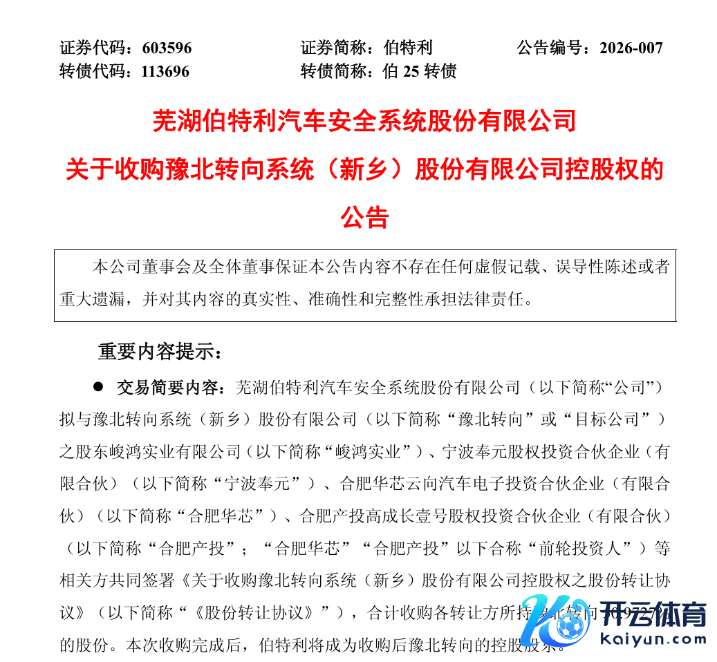 2026年汽车零部件行业并购大幕,由三场控股型收购最初拉开。伯特利拟收购豫北转向控股权、锐新科技狡计拿下德恒装备51%股权、天汽模拟购入东实股份60%股份,虽布局不同细分赛谈,却均紧扣产业链补短板中枢,以控股模式推动深度整合。