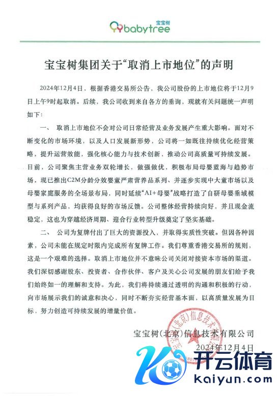 新浪科技讯 12月4日晚间音书,宝宝树集团发布对于“取消上市地位”的声明。声明称,取消上市地位不会对公司泛泛野心及业务发展产生紧要影响。公司举座野心抓续向好,而且现款流富厚,这也为穿越经济周期、趋奉行业转型升级奠定了坚实基础。