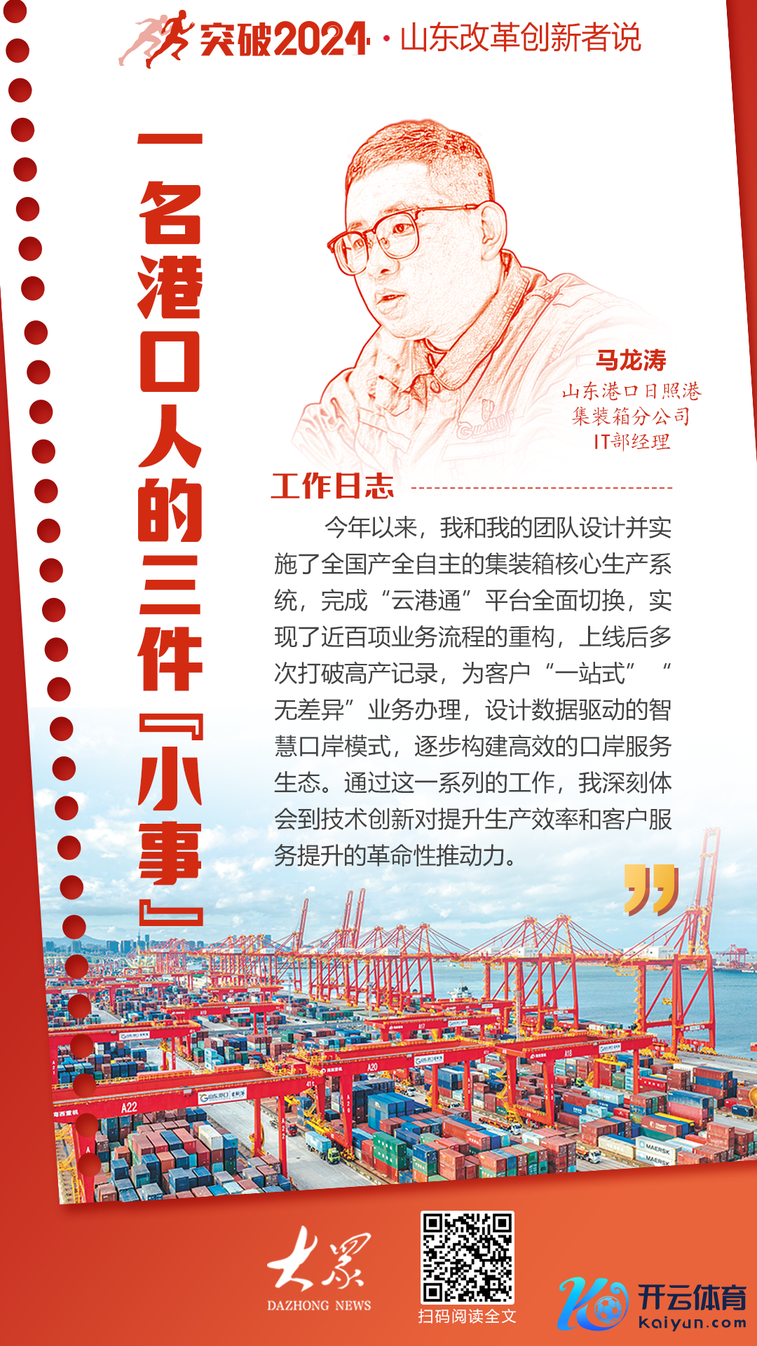 编者按 2024年是中华东说念主民共和国种植75周年,是达成“十四五”规划狡计任务的要津一年,转变改进成为各行业各鸿沟的主题干线。本年以来,山东聚焦要点鸿沟、超越要津法子,探索改进、狠执落实,展现出新算作、赢得了新收效。本报今推“防碍2024——山东转变改进者说”全媒体联动报说念云开体育,省市党报记者深入企业车间、坐蓐一线,通过东说念主物亲历、记者不雅察敷陈转变改进故事。敬请护士。