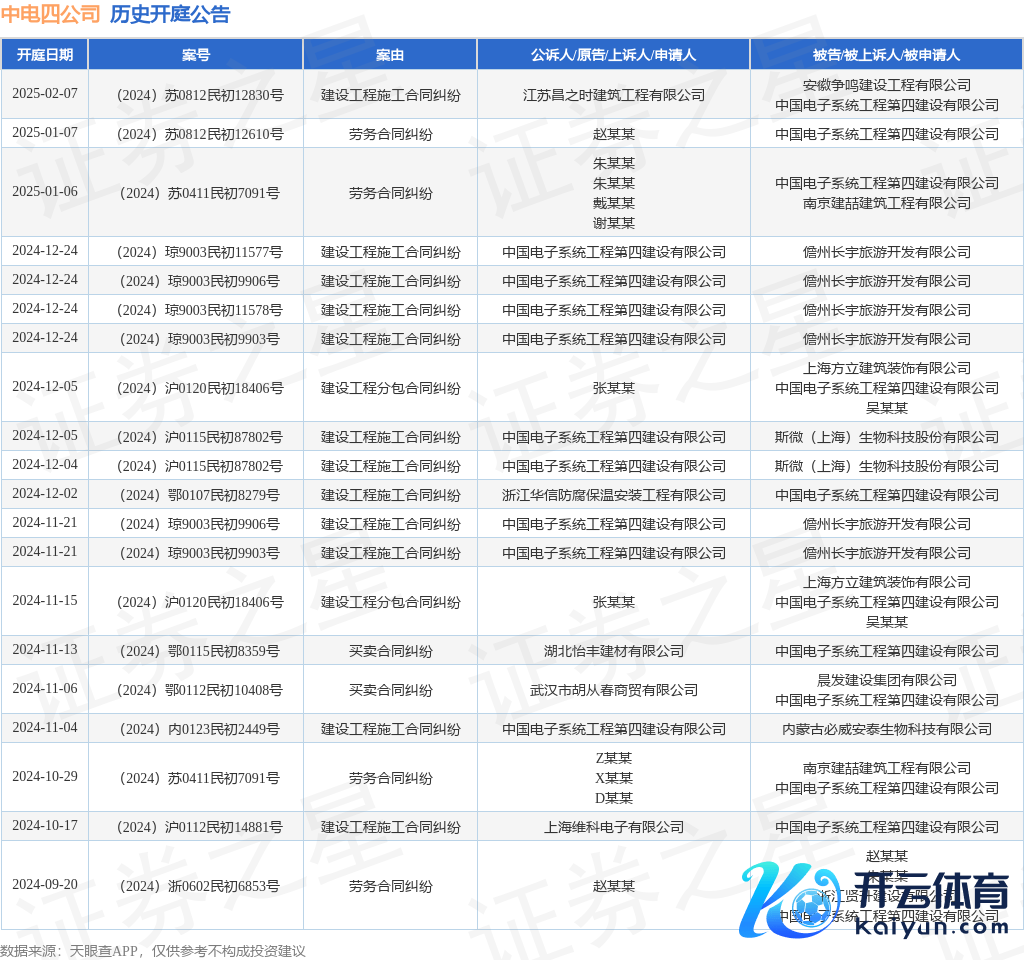 本站讯息云开体育,说明天眼查APP表露,近日公布了一则中国电子系统工程第四建造有限公司行动被告/被上诉东说念主的开庭公告,详备本色如下: