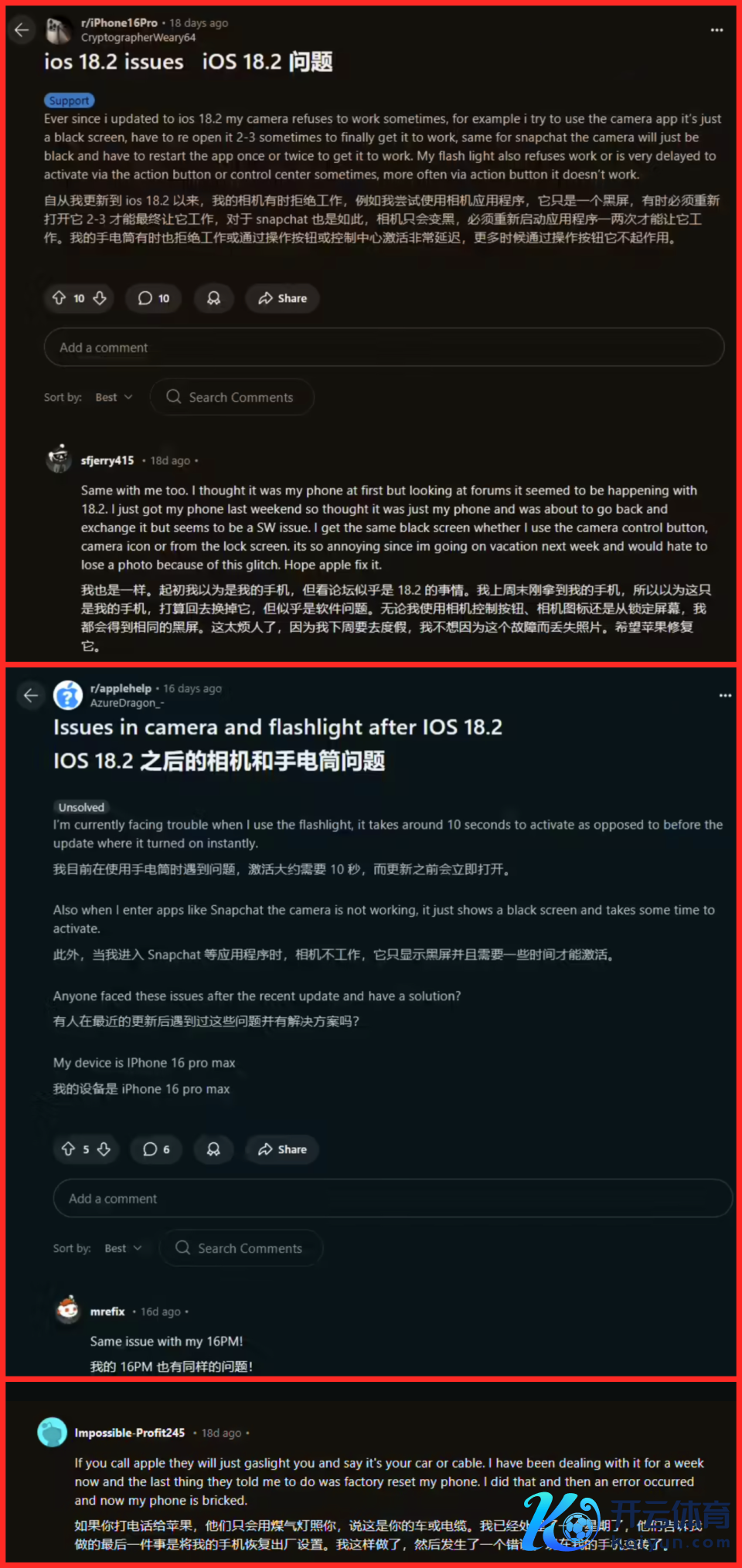 而且一位用户Cryptographer64在酬酢平台上示意自从更新到iOS 18.2后,我的相机无意全齐无法使用,开放相机利用时只会显露黑屏,闲居需要重启两到三次智商收复正常。