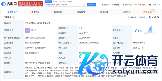 新浪科技讯 2月18日下昼音讯,天眼查App清晰,近日,华熙生物科技(威海)有限公司建造,法定代表东说念主为邹松岩,注册成本2000万东说念主民币,目标限制包括存一火一火工家具本领研发、科技中介处事、工程和本领商量和历练发展、医学商量和历练发展等。推动信息清晰,该公司由华熙生物科技股份有限公司、润辉生物本领(威海)有限公司共同执股。(罗宁)