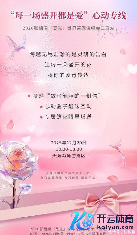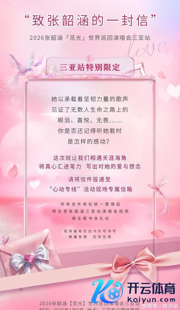 本次行为以“每一场绽放,齐是爱”为主题,会通花车巡游、理由互动、限量专属“梦里花”补救等多元款式,竭力于打造一场充满庆典感与猖厥氛围的演唱会前奏,让歌迷在碧海蓝天之间,提前感受「觅光」之旅的平和与感动。其中,“致张韶涵的一封信”行为三亚越过截至行为也将同步驱动。歌迷可在现场领取专属空缺卡片,亲手翰写下与张韶涵音乐相伴的故事、对她的撑合手与念念念,并送达至现场开辟的专属信箱。该款式以传统书信为载体,不仅呼应张韶涵音乐中恒久流淌的诚实与疗养力,更将成为三亚站唯一无二的系念象征。