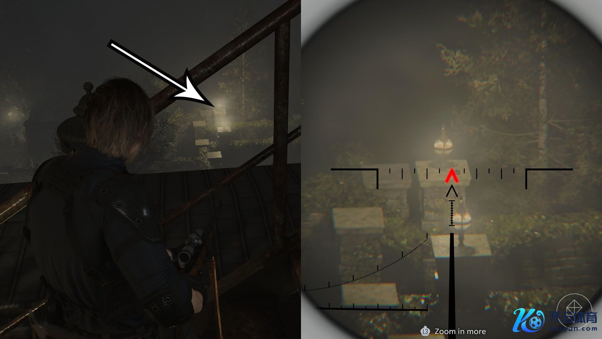 在格蕾丝回到直升机并切换到里昂后,走过阳台并爬上第一段楼梯。向北看,不错发现远方有两盏灯。