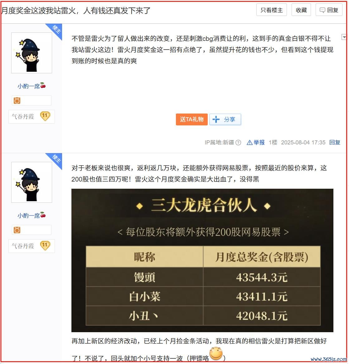 愈加“过分”的是,游戏官方为了进一步激活市集活力,珍摄长青的交易动态,致使破天荒的拿出游戏营收,径直按照玩家们对游戏的活跃度和孝敬度,每周分现款。还是稀有以万计的玩家在这项名为“游戏合资东说念主”招募的权略中径直获益,头部大佬更是领取到了每个月跳跃一万元的月薪,以及高达十几万的网易股票分成。