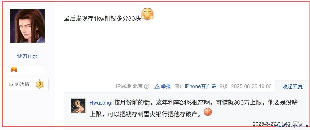 有玩家分析:按照现时的铜价,这年利率有24%,很高啊!可惜就300万上限,他若是没啥上限,不错把钱存到雷火银行,一年利息十万东说念主民币轻减迁延。