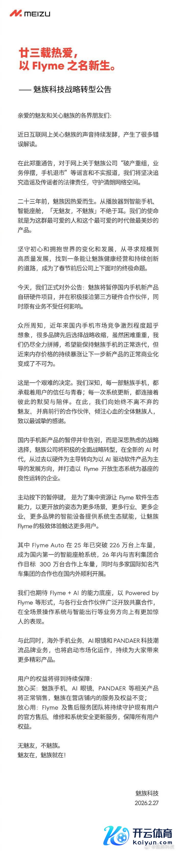 【大河财立方 记者 岳炎霖 文图】2月27日,针对近日公论风云,魅族科技发布政策转型公告,澄莹“歇业重组、业务停摆、手机退市”等外传开云体育(中国)官方网站,告示暂停国内手机新产物自研硬件名目,并积极辩论第三方硬件和洽伙伴,转向以AI运行软件产物为主导的发展见地。