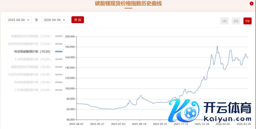 在人人锂矿产量裁汰的配景下,碳酸锂价钱走势备受阛阓关怀。据第三方机构Mysteel数据统计,收尾4月3日,电板级碳酸锂报价158000元/吨,相较于2025年下半年6-7万元的价钱水平,依然达成超1.2倍高潮。