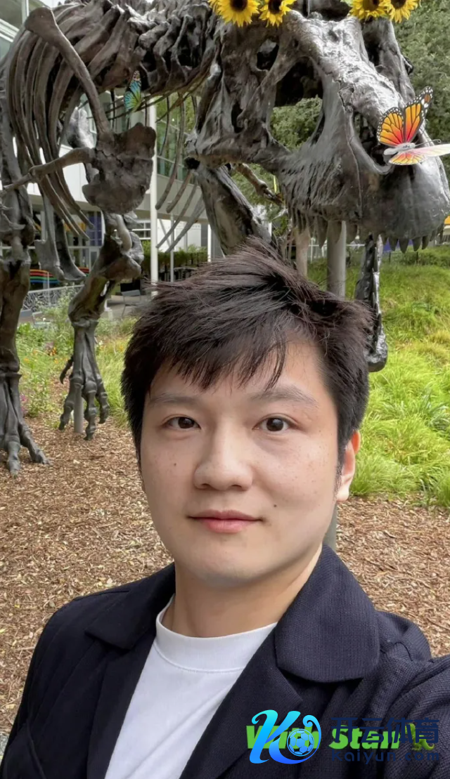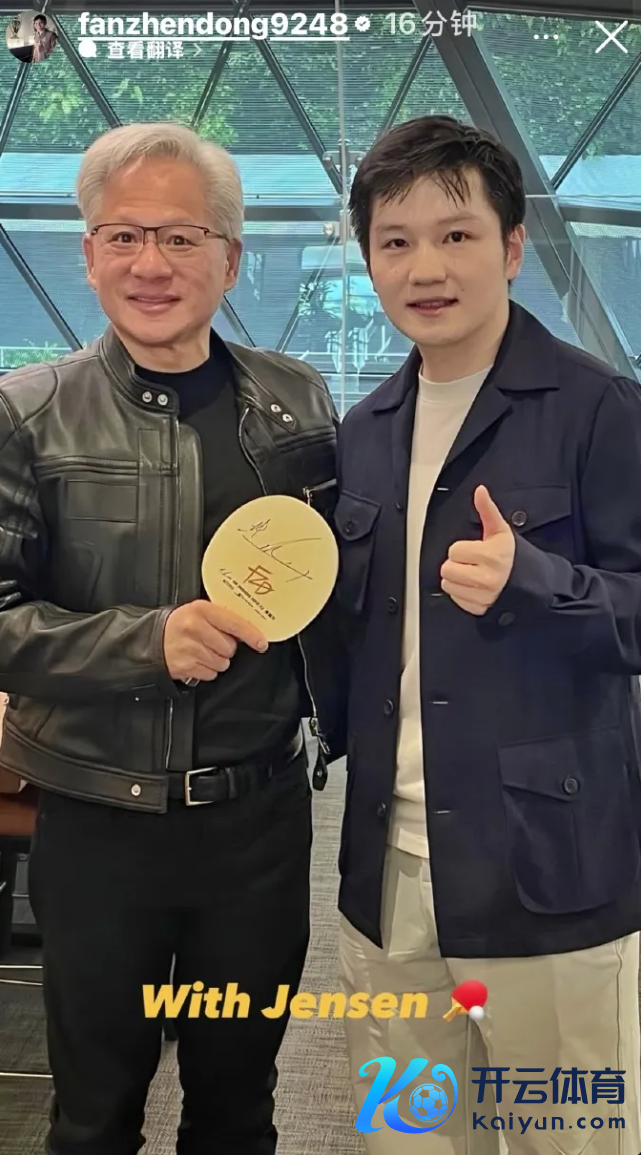4月21日,樊振东更新社媒,共享和英伟达创举东说念主黄仁勋的合影,并在好意思国加州谷歌总部与霸王龙化石自拍。